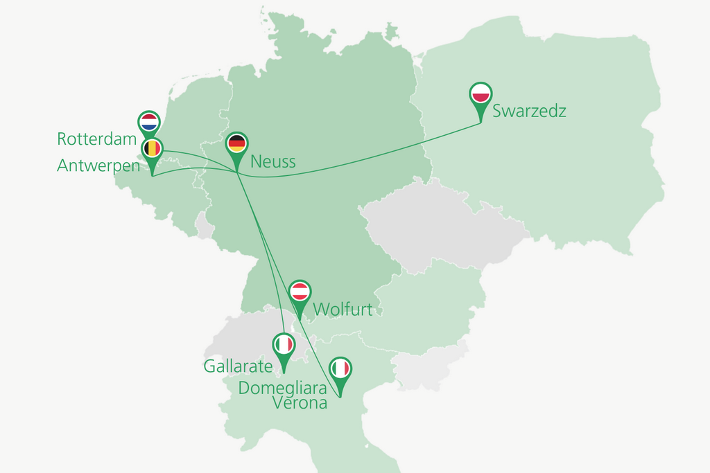 Dank direktem Zugang zu Bahnstrecken, Straßenknotenpunkten und Binnenwasserstraßen ermöglichen wir flexible Transportlösungen im europäischen Kombinierten Verkehr.